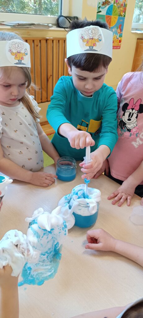 27 lutego dzieci zrobiły sztuczny śnieg. Biały miękki puch do złudzenia imitował prawdziwy śnieg i pozwolił na rozwój wyobraźni, bo tylko ona ogranicza pole do zabawy.