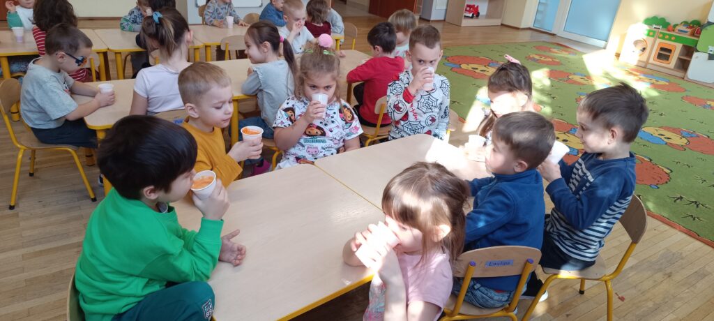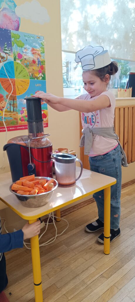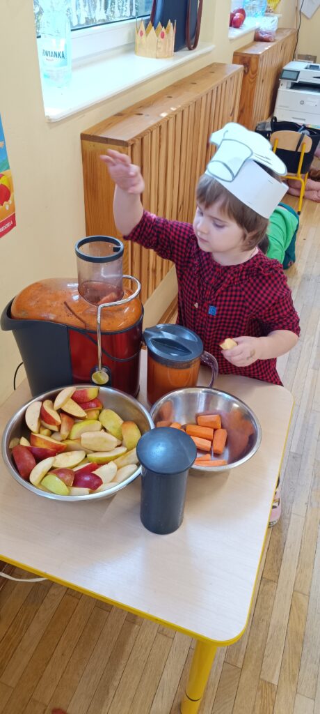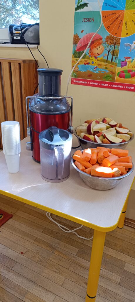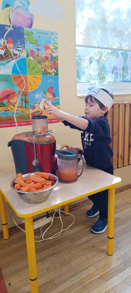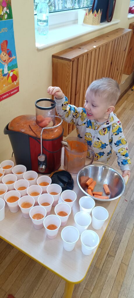 20 lutego przedszkolaki wykonały sok jabłkowo – marchewkowy. Dzieci poznały zasady działania wyciskarki do soku. Obserwowaliśmy jak przybywa soku w dzbanku. Każdy wrzucał składniki do maszyny, a ona zamieniała je w pyszny sok. Gotowy sok był przepyszny, a co najważniejsze bardzo zdrowy, bo bez dodatku cukru. 🥕🍎