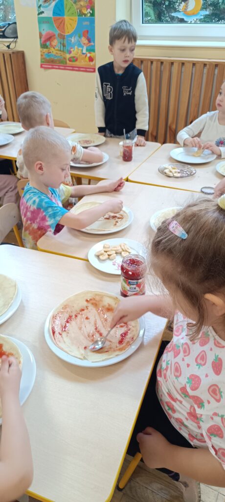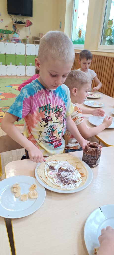13 marca odbyły się kolejne zajęcia kulinarne w Jeżykach. Dzieci dowiedziały się, że do zrobienia ciasta na naleśniki potrzebne są: mąka, mleko, jajka i woda. Pomogły w zrobieniu doskonałego ciasta. Panie z kuchni usmażyły naleśniki, a dzieci w tym czasie nakryły do do stołu. Każdy sobie sam wybrał ulubione składniki do swojego naleśnika. To były słodko- pyszne zajęcia.🤤🥞