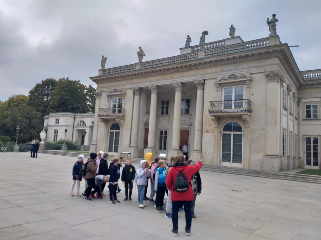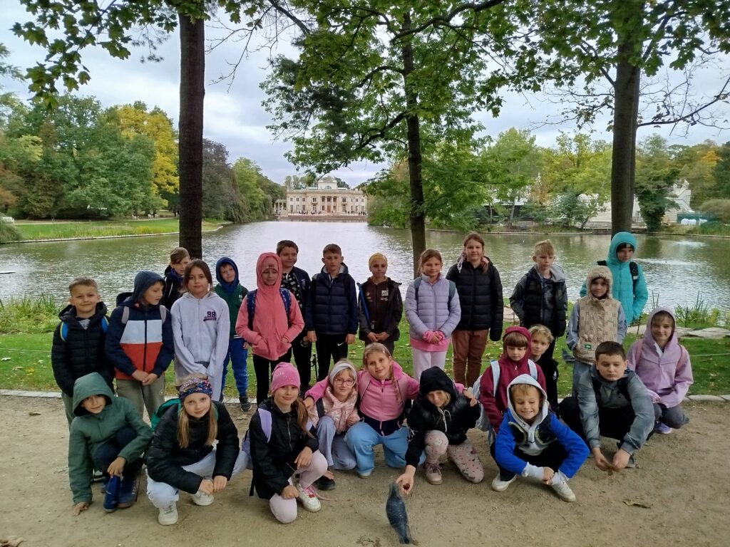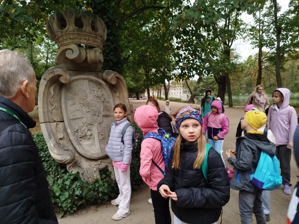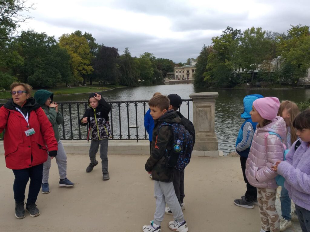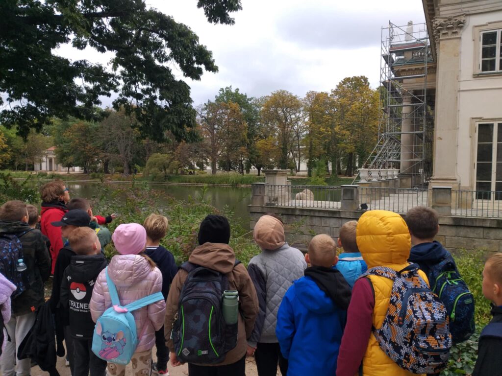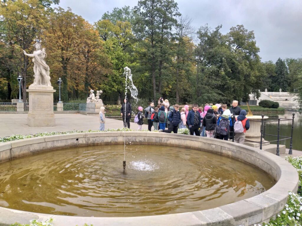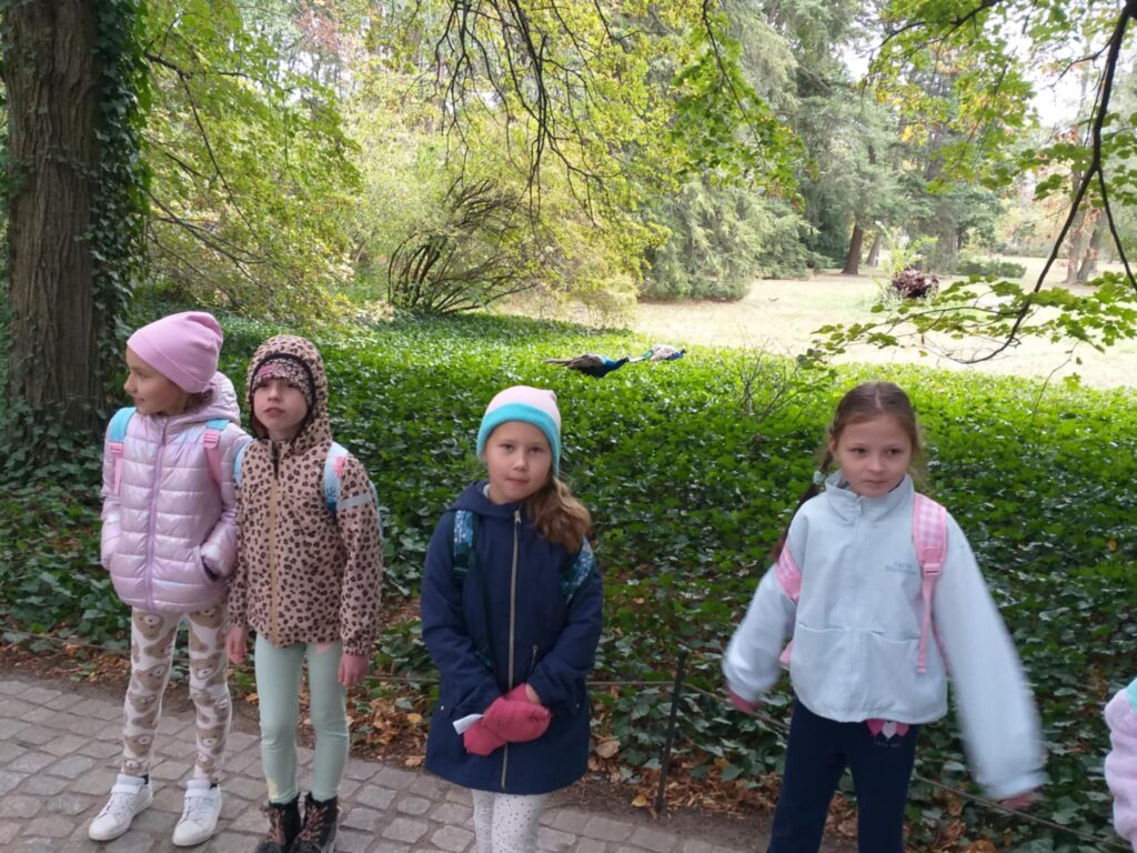 Kolejnym punktem programu było zwiedzanie jednego z najpiękniejszych miejsc w Warszawie – Łazienek Królewskich. Dzieci podążały jesiennymi ścieżkami wsłuchując się w opowieści o historii tego pięknego miejsca. Przez cały czas towarzyszyły uczniom wiewiórki oraz pawie dumnie podążające śladem naszych wychowanków 🙂