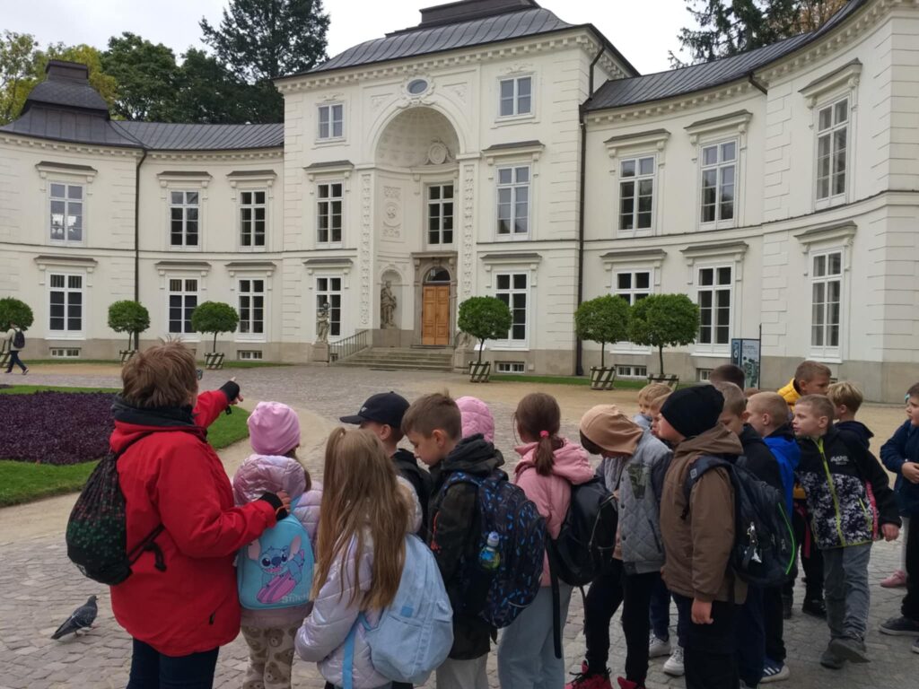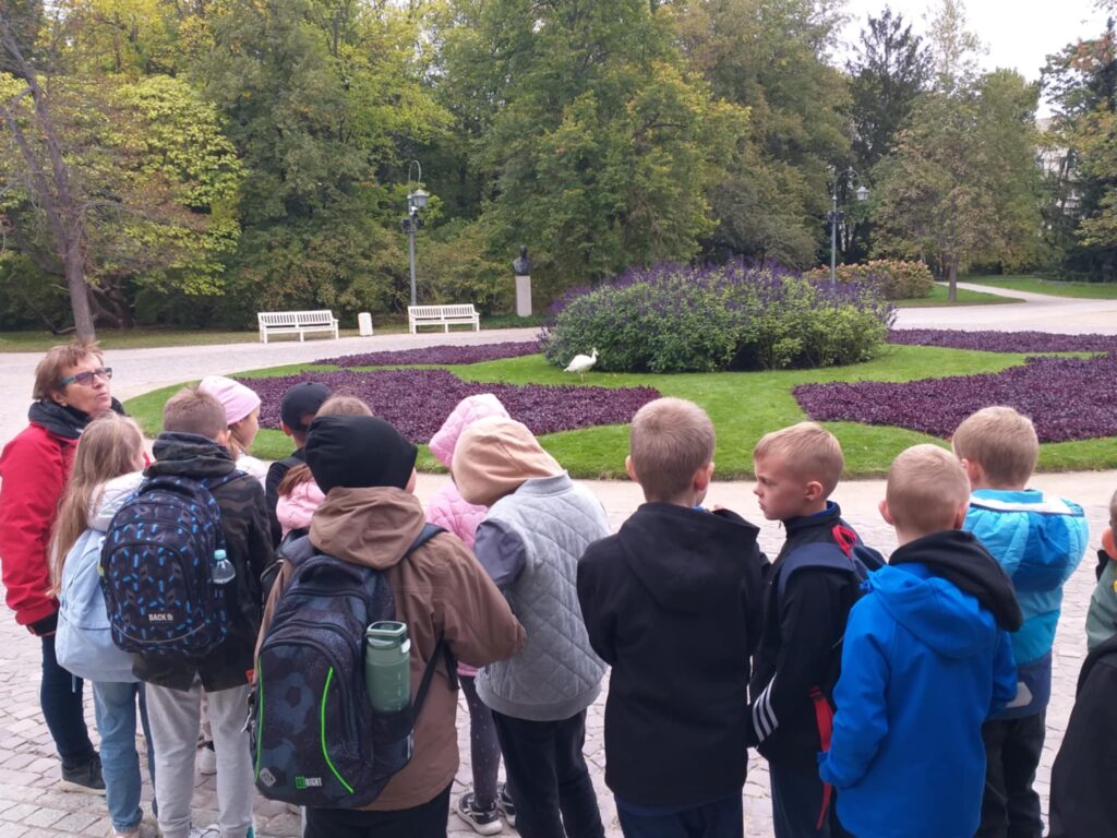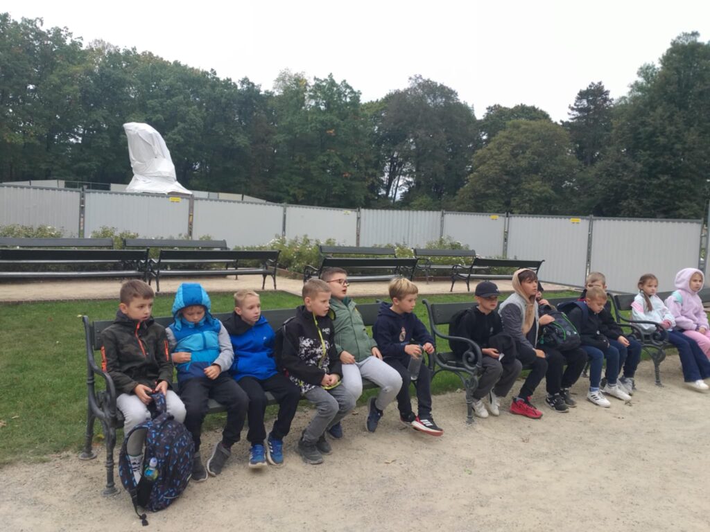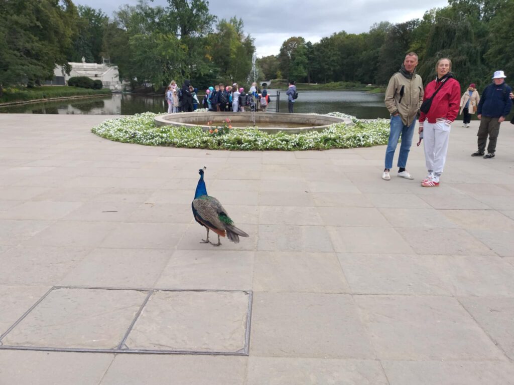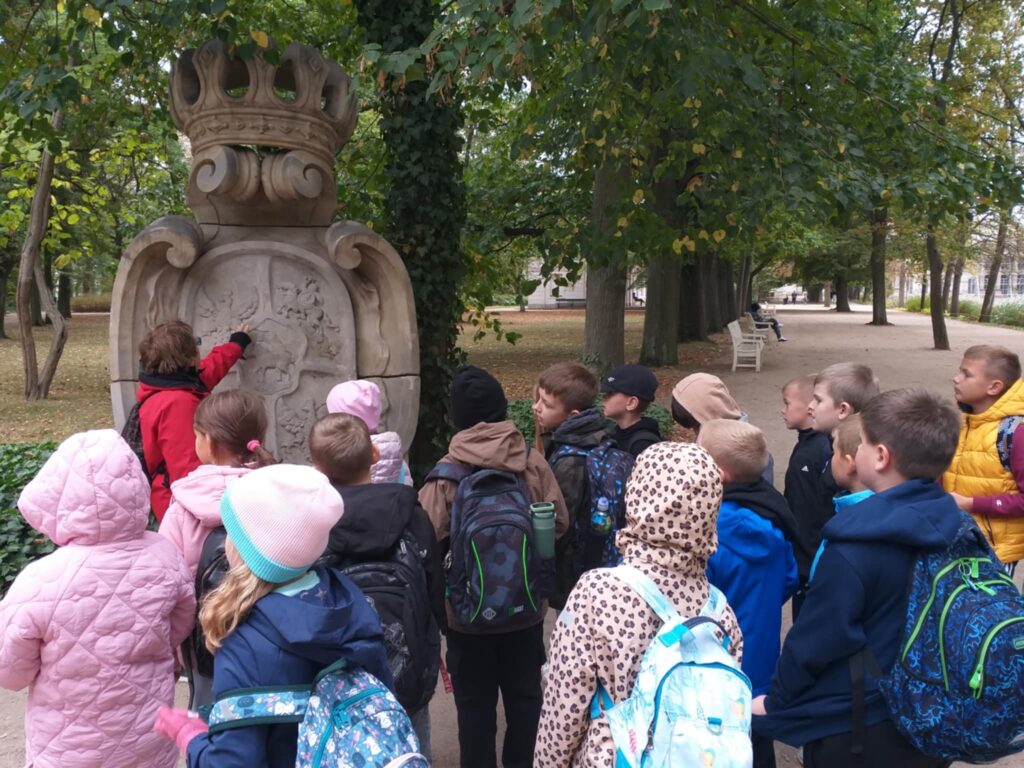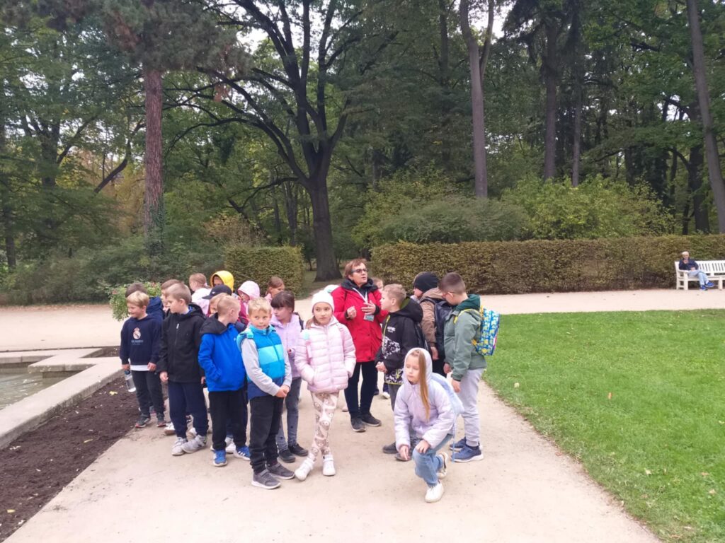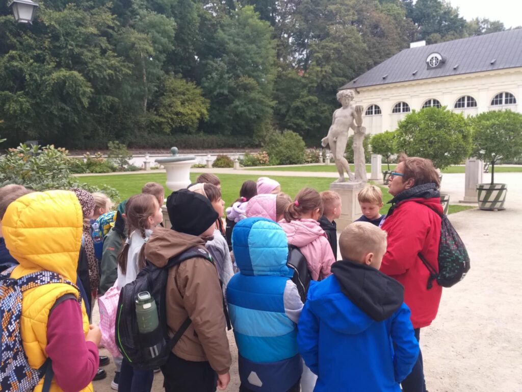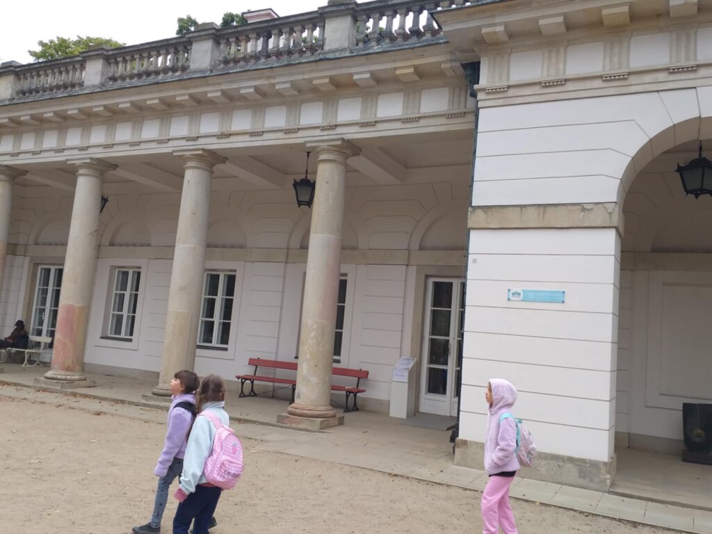 Kolejnym punktem programu było zwiedzanie jednego z najpiękniejszych miejsc w Warszawie – Łazienek Królewskich. Dzieci podążały jesiennymi ścieżkami wsłuchując się w opowieści o historii tego pięknego miejsca. Przez cały czas towarzyszyły uczniom wiewiórki oraz pawie dumnie podążające śladem naszych wychowanków 🙂
