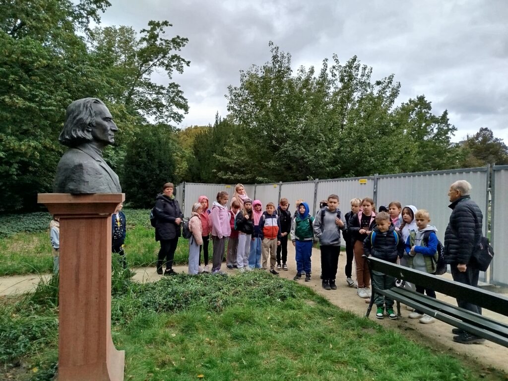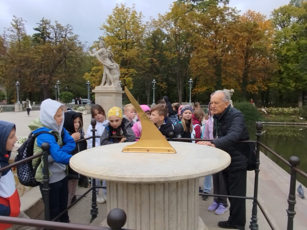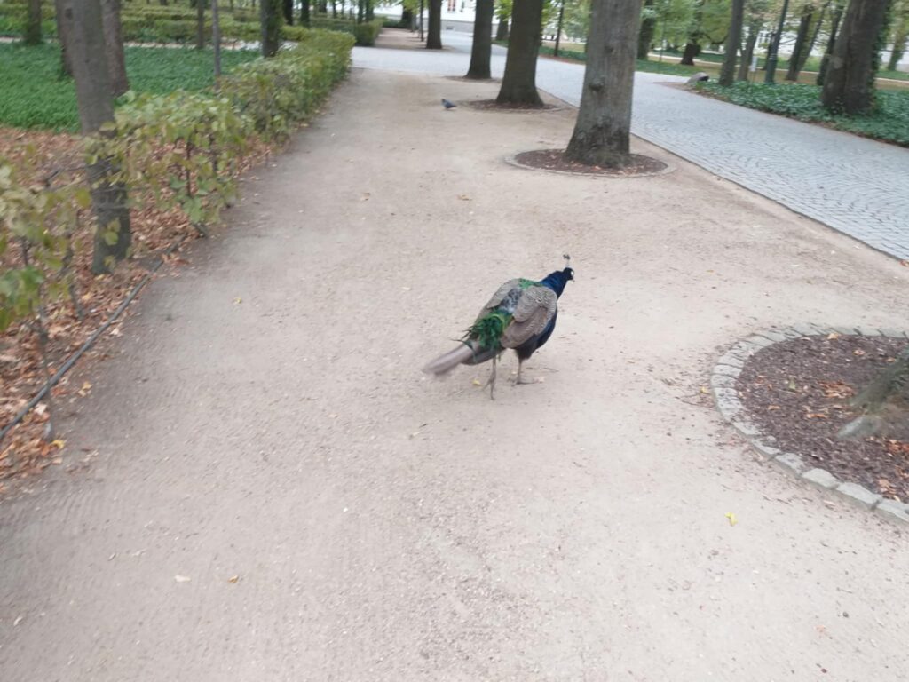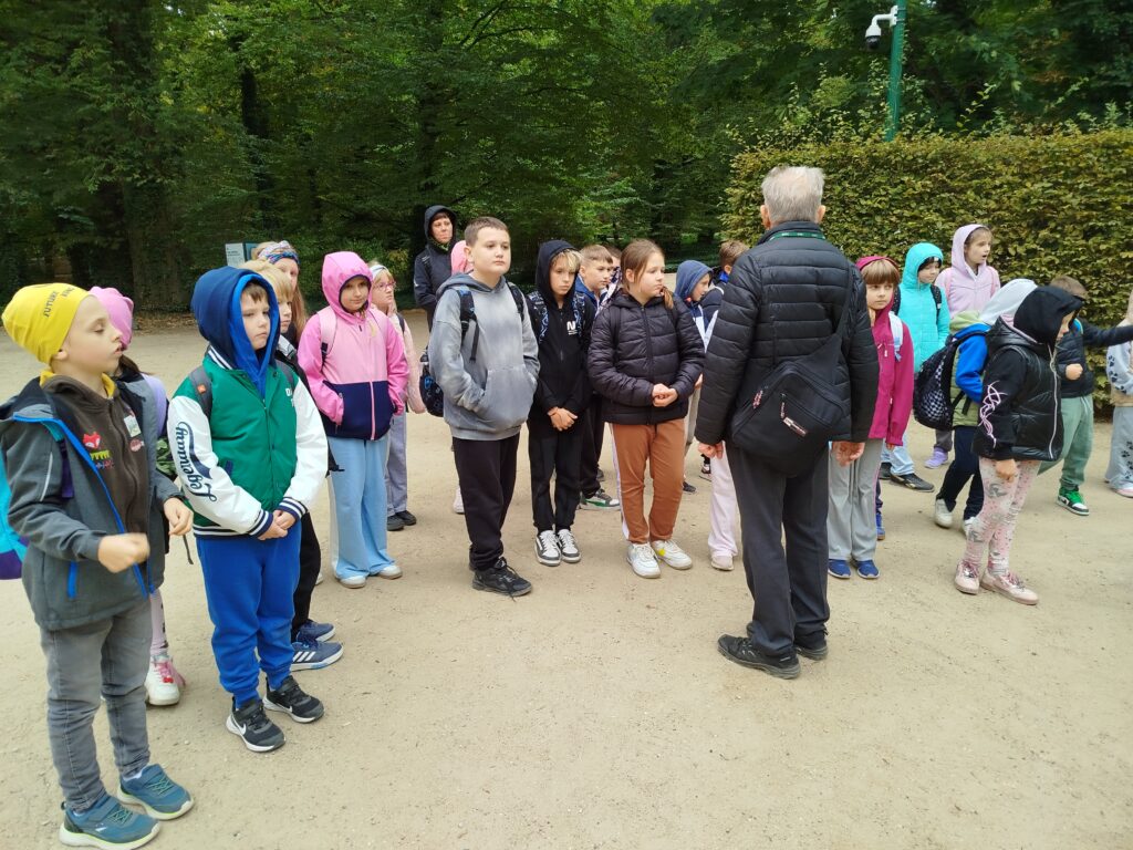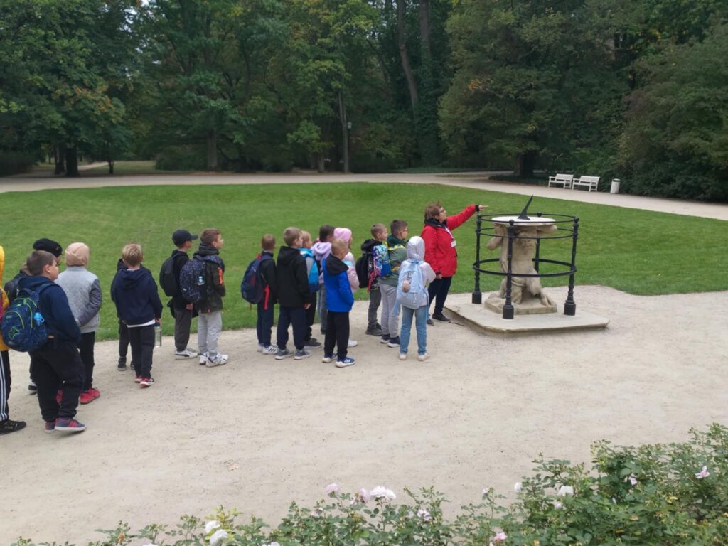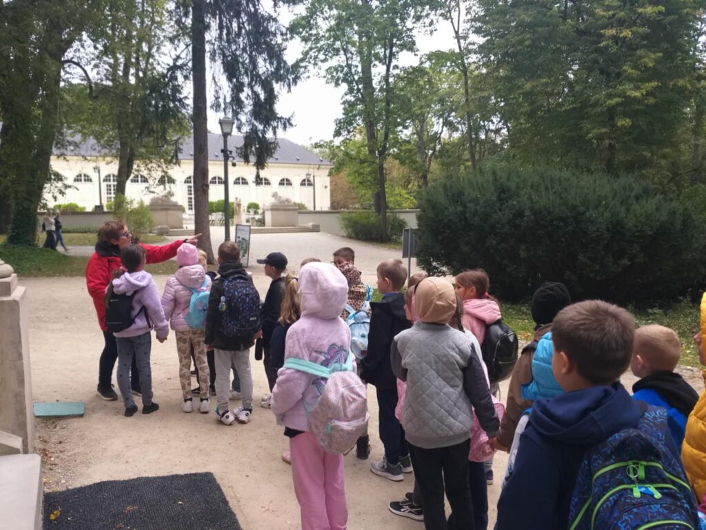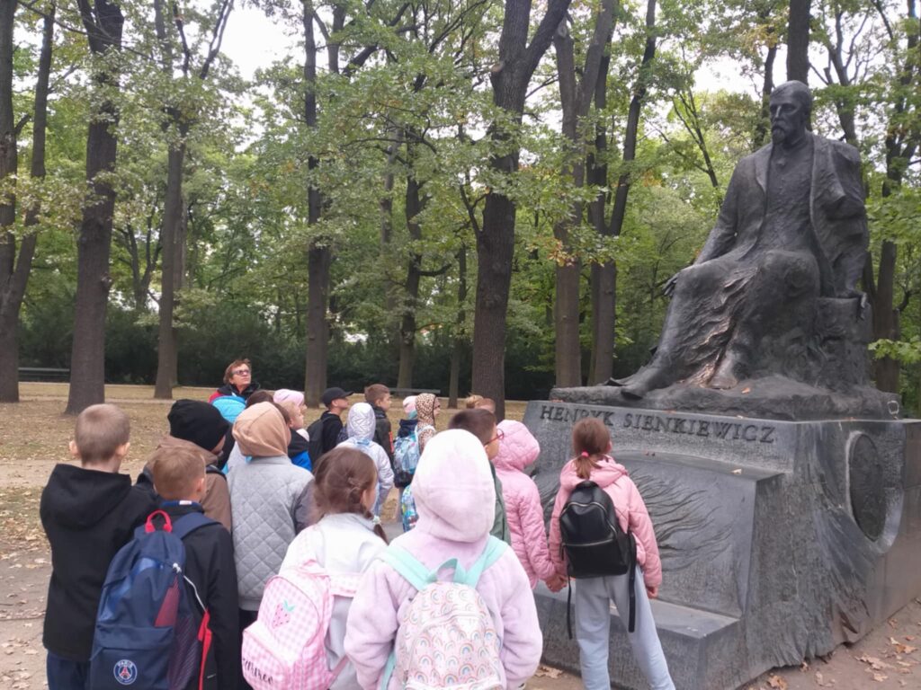 Kolejnym punktem programu było zwiedzanie jednego z najpiękniejszych miejsc w Warszawie – Łazienek Królewskich. Dzieci podążały jesiennymi ścieżkami wsłuchując się w opowieści o historii tego pięknego miejsca. Przez cały czas towarzyszyły uczniom wiewiórki oraz pawie dumnie podążające śladem naszych wychowanków 🙂