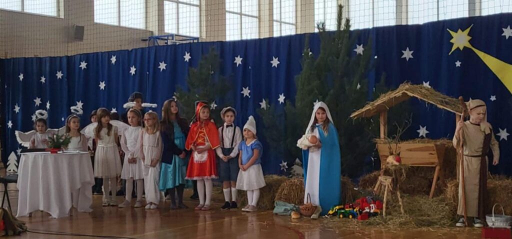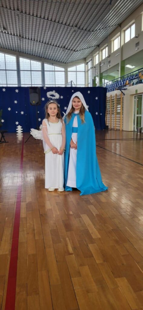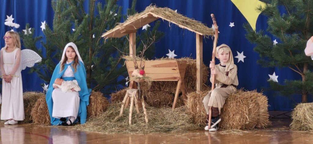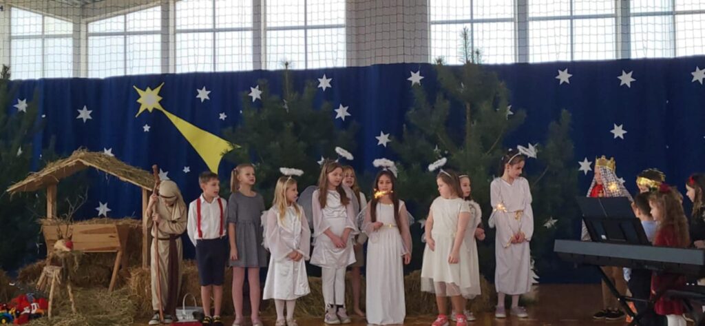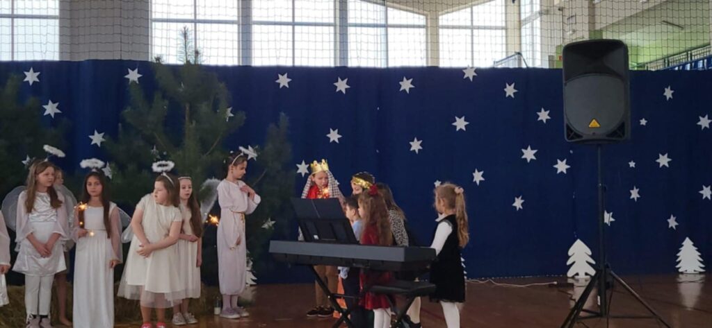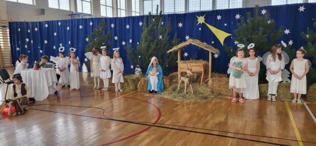 W świąteczną atmosferę wprowadzili nas uczniowie klasy II, III, IV oraz przedszkolaki, którzy wraz z chórem uczennic ze starszych klas przygotowali przedstawienie jasełkowe. Zaprezentowali je 18 grudnia, przypominając w ten sposób wydarzenia sprzed ponad dwóch tysięcy lat, kiedy to w Betlejem narodziło się Boże Dzieciątko. Dzieci wcieliły się w role Maryi i Józefa, pasterzy, aniołów, trzech króli, przybywających złożyć pokłon Jezusowi narodzonemu w ubogiej stajence. W tym roku przedstawienie było inne niż zwykle, ponieważ do Jezuska przybyli również: Czerwony Kapturek, Kopciuszek, Pinokio, Smerfetka, Jaś i Małgosia a także najmłodsze przedszkolaki z naszego oddziału przedszkolnego, którzy podarowali Jezuskowi zabawki.