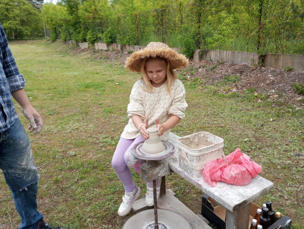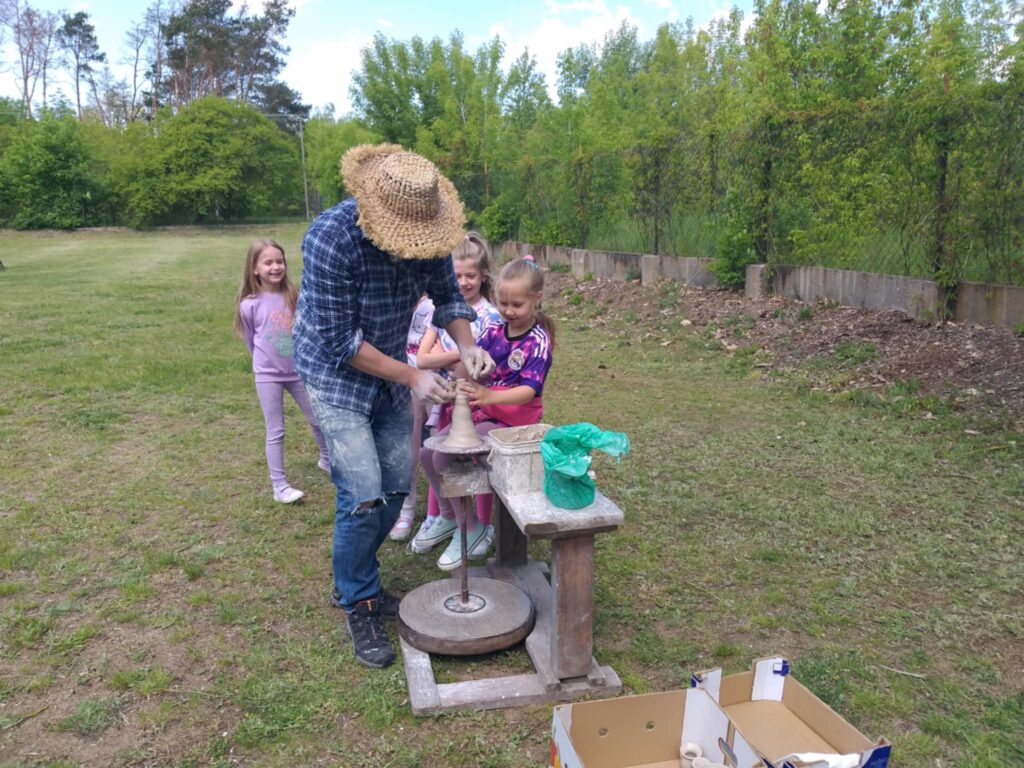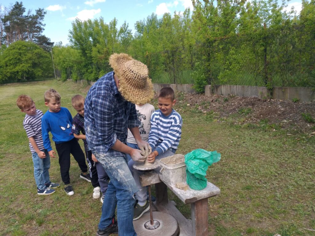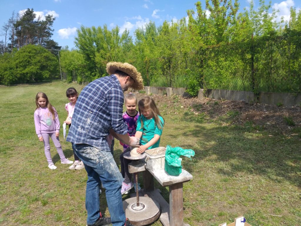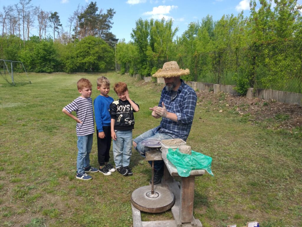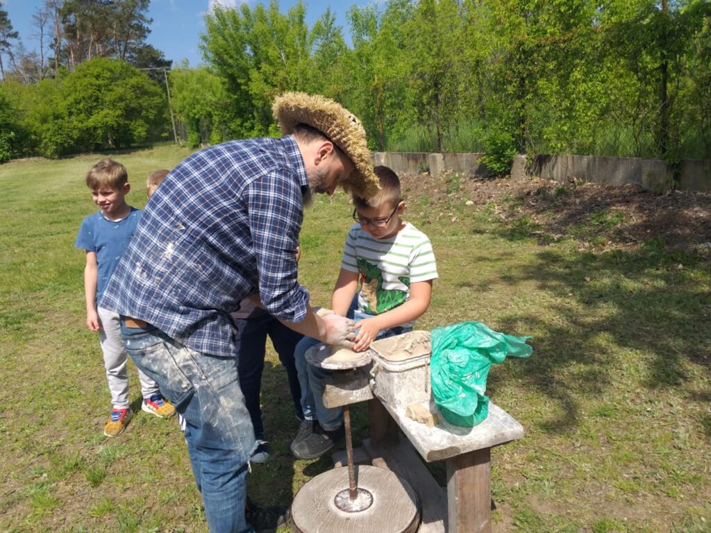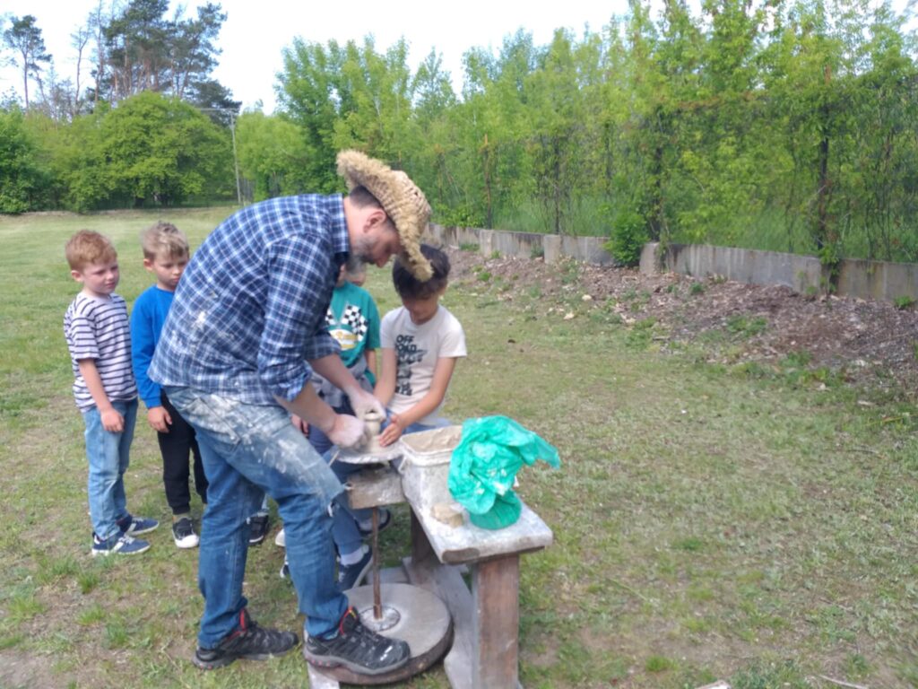P. Sebastian wprowadził dzieci w niezwykły świat ceramiki, opowiedział o właściwościach gliny oraz omówił etapy powstawania gotowego produktu ceramicznego. Zaprezentował sposób wykonania dzbanków na kole garncarskim poruszanym za pomocą nóg. Pokaz był inspiracją dla dzieci do twórczej pracy, ponieważ każde dziecko mogło usiąść przy garncarskim kole i przy pomocy naszego gościa ulepić swój dzbanuszek. Uczniowie z zapałem podjęli się tego zadania i udowodnili, że nie ma dla nich rzeczy niemożliwych takich jak lepienie garnków. Własnoręcznie formowali i toczyli naczynia na kole garncarskim i z ogromnym zaciekawieniem obserwowali, jak z kawałka gliny powstaje wspaniałe dzieło. Twórcza praca przyniosła dzieciom wiele radości i satysfakcji.