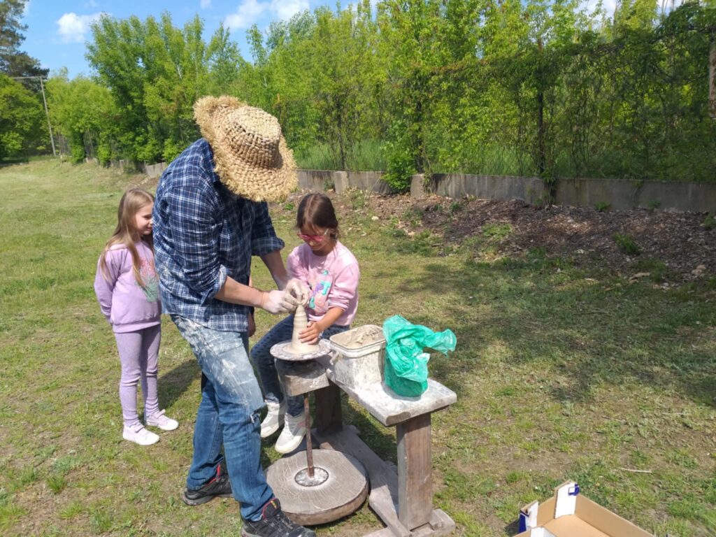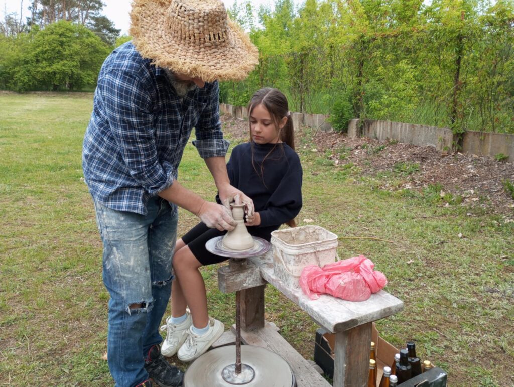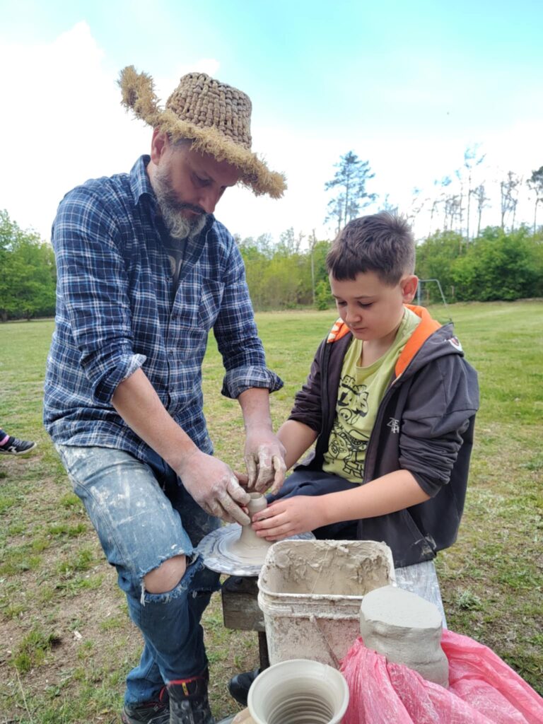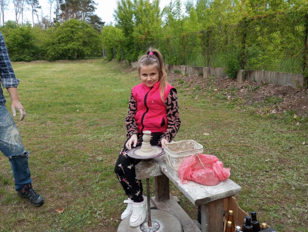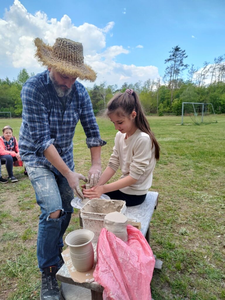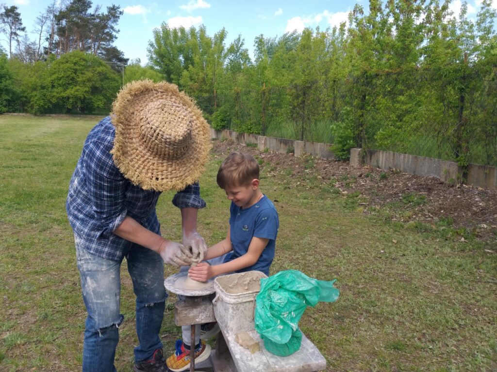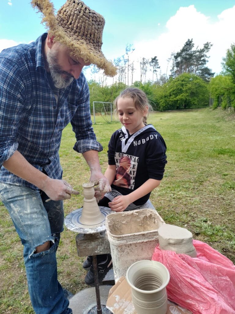 P. Sebastian wprowadził dzieci w niezwykły świat ceramiki, opowiedział o właściwościach gliny oraz omówił etapy powstawania gotowego produktu ceramicznego. Zaprezentował sposób wykonania dzbanków na kole garncarskim poruszanym za pomocą nóg. Pokaz był inspiracją dla dzieci do twórczej pracy, ponieważ każde dziecko mogło usiąść przy garncarskim kole i przy pomocy naszego gościa ulepić swój dzbanuszek. Uczniowie z zapałem podjęli się tego zadania i udowodnili, że nie ma dla nich rzeczy niemożliwych takich jak lepienie garnków. Własnoręcznie formowali i toczyli naczynia na kole garncarskim i z ogromnym zaciekawieniem obserwowali, jak z kawałka gliny powstaje wspaniałe dzieło. Twórcza praca przyniosła dzieciom wiele radości i satysfakcji.