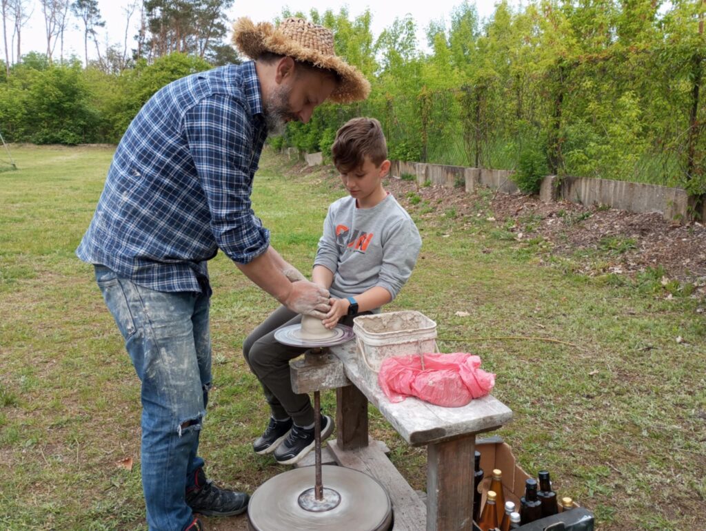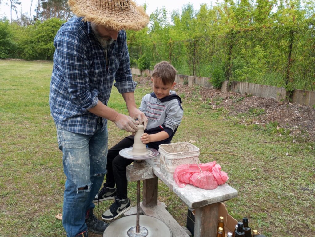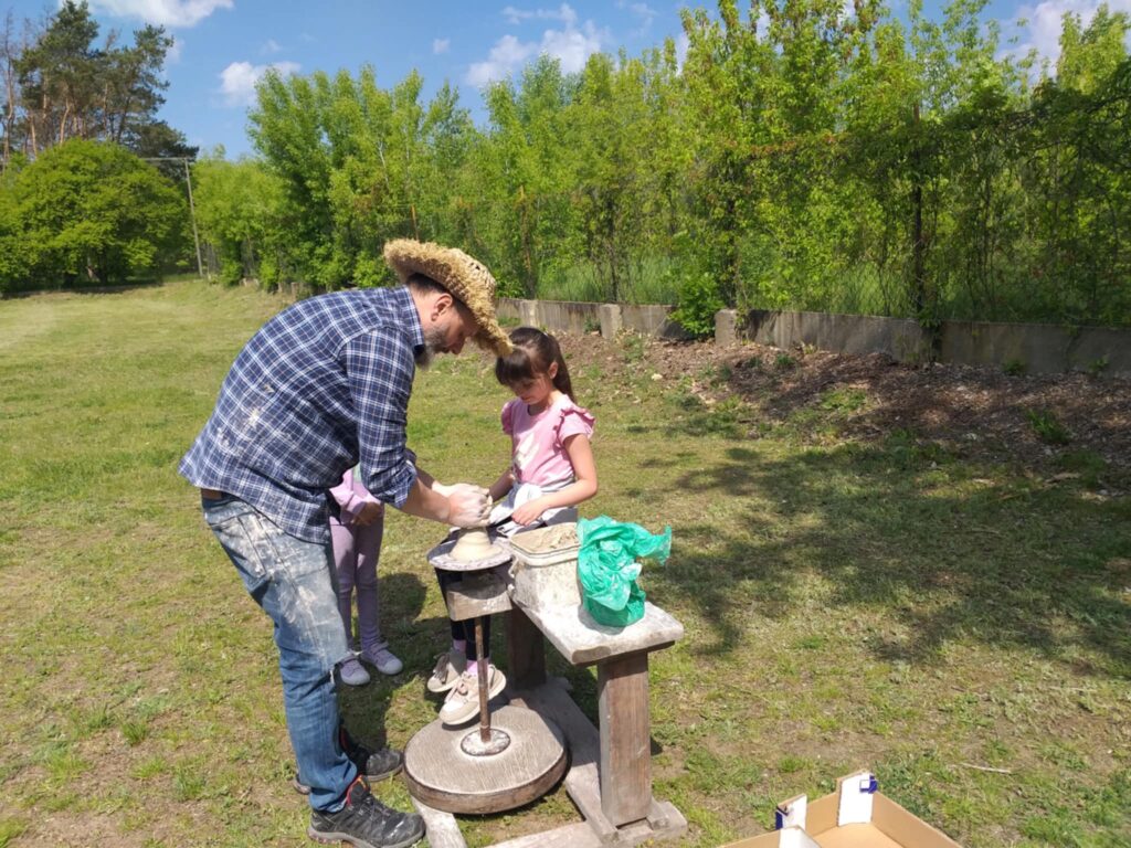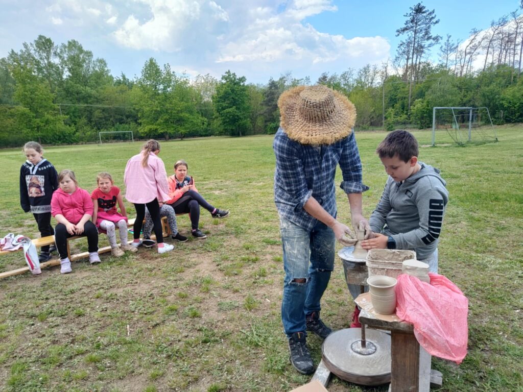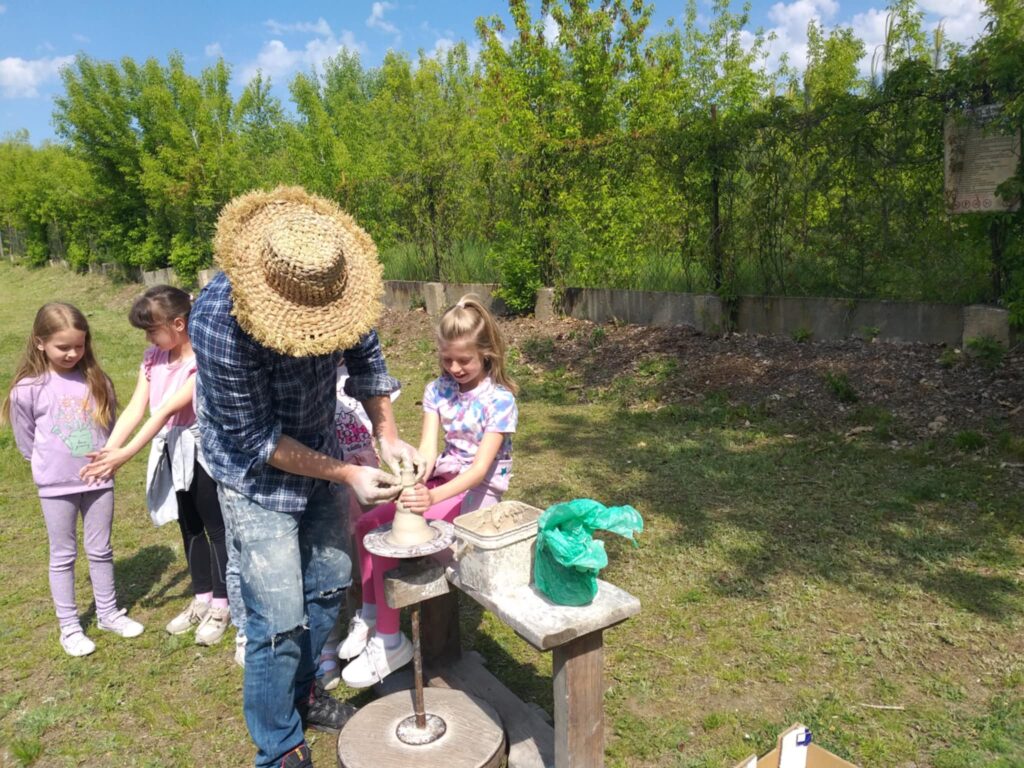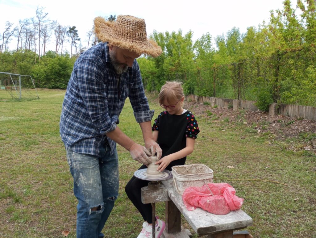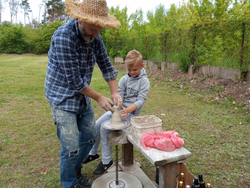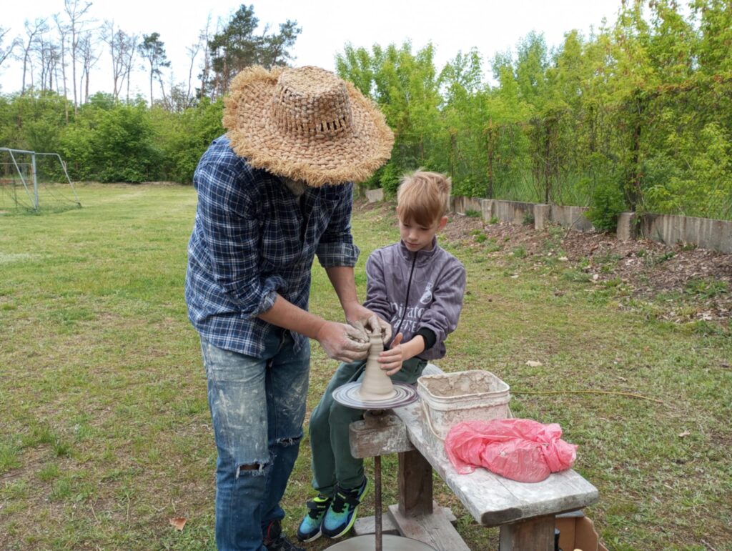 P. Sebastian wprowadził dzieci w niezwykły świat ceramiki, opowiedział o właściwościach gliny oraz omówił etapy powstawania gotowego produktu ceramicznego. Zaprezentował sposób wykonania dzbanków na kole garncarskim poruszanym za pomocą nóg. Pokaz był inspiracją dla dzieci do twórczej pracy, ponieważ każde dziecko mogło usiąść przy garncarskim kole i przy pomocy naszego gościa ulepić swój dzbanuszek. Uczniowie z zapałem podjęli się tego zadania i udowodnili, że nie ma dla nich rzeczy niemożliwych takich jak lepienie garnków. Własnoręcznie formowali i toczyli naczynia na kole garncarskim i z ogromnym zaciekawieniem obserwowali, jak z kawałka gliny powstaje wspaniałe dzieło. Twórcza praca przyniosła dzieciom wiele radości i satysfakcji.