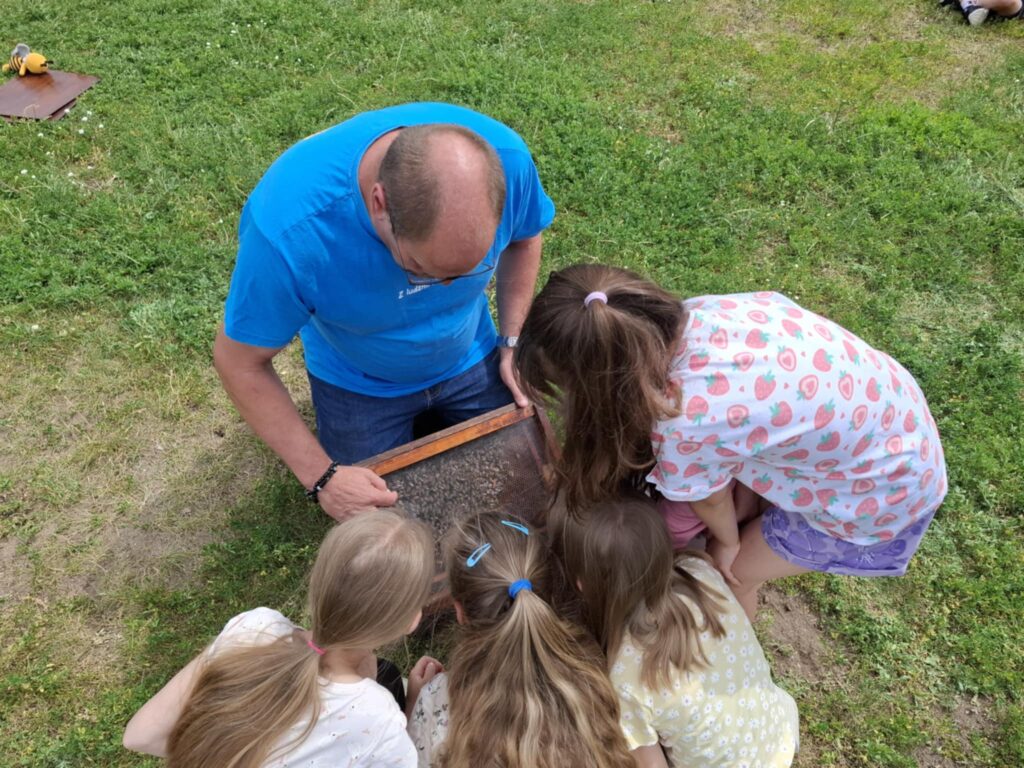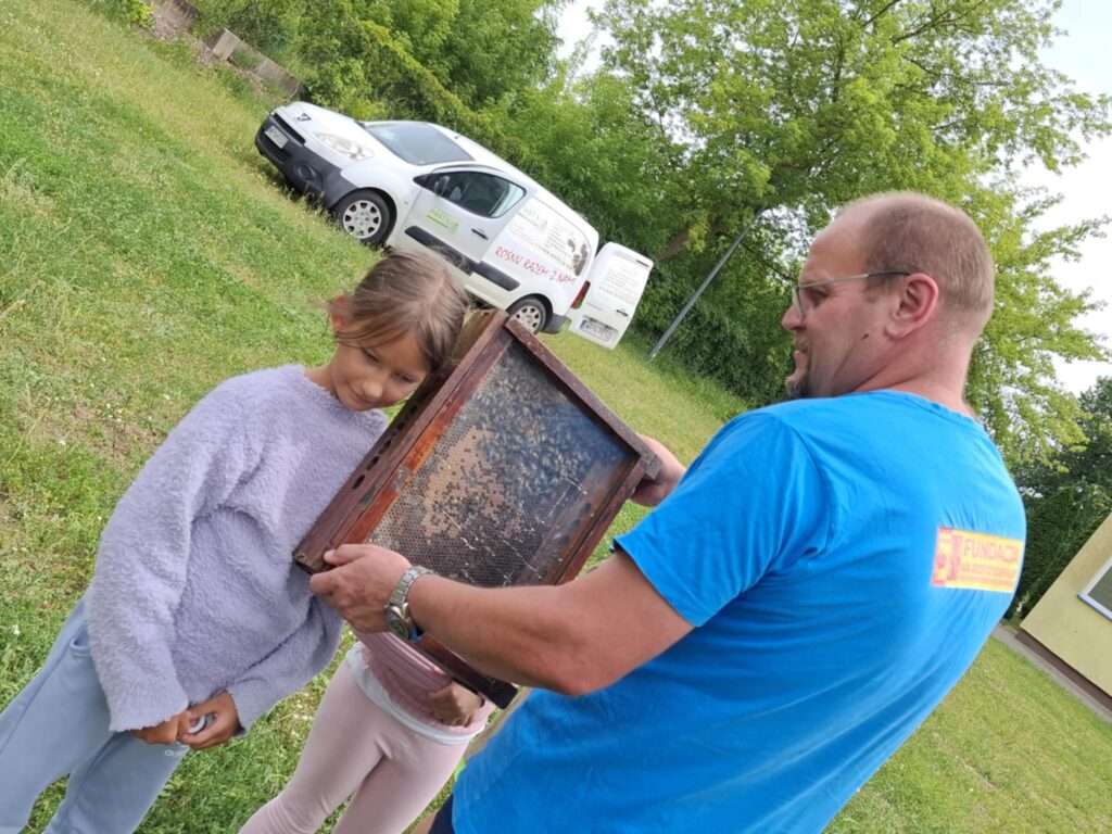 Obserwowali także pracujące pszczoły znajdujące się w ramce za szybą.