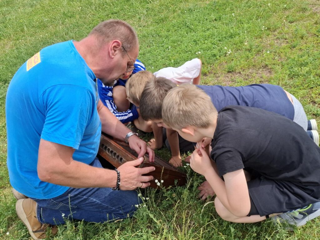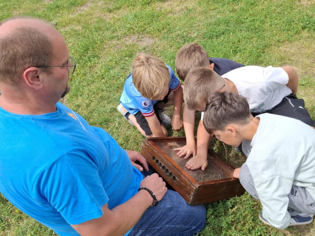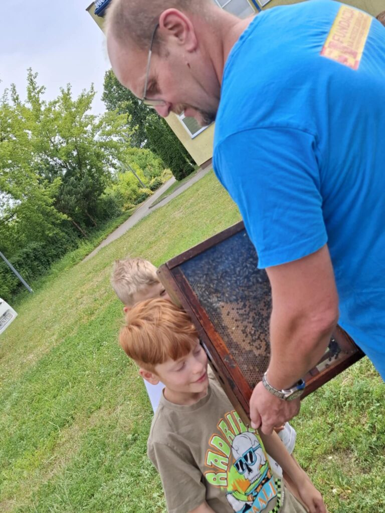 Podczas spotkania zobaczyli z bliska prawdziwy ul, ramkę pszczelą, specjalistyczne ubranie pszczelarza oraz narzędzia wykorzystywane w pracy, min. podkurzacz.