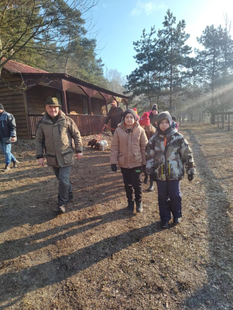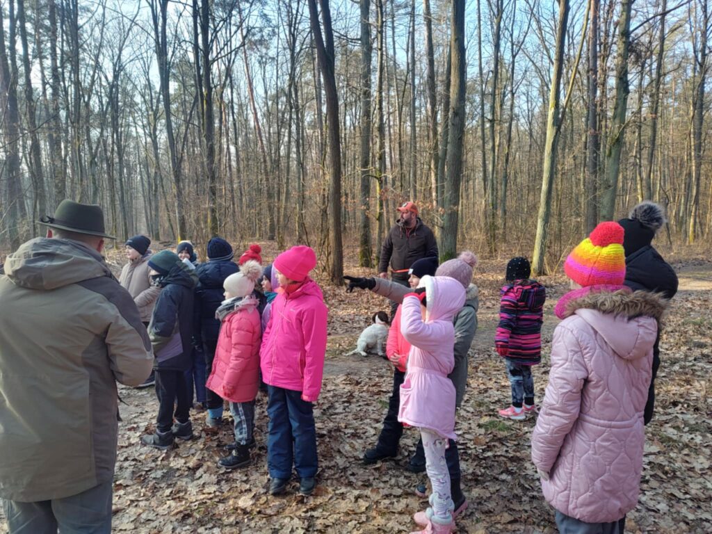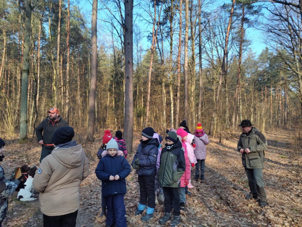 Po przyjeździe na miejsce, dzieci zostały przywitane przez prezesa i skarbnika Koła Łowieckiego „Narew”. Podczas spaceru po lesie pan Paweł Węgłowski i pan Mateusz Burza opowiedzieli dzieciom o zwierzętach żyjących w naszych lasach. Dzieci dowiedziały się m.in. jak nazywają się części ciała zwierząt, po co w lesie jest sól, co zrobić, gdy znajdziemy małe samotne zwierzątko, jak zachowywać się w lesie, jak dokładnie nazywają się samce i samice różnych gatunków zwierząt, czym różni się róg od poroża. Dzieci poznały przyrodę patrząc, słuchając i dotykając. Ogromnym zaskoczeniem było spotkanie w lesie dwóch łosi, a także dzięcioła dużego. W trakcie spaceru natknęliśmy się na tabliczkę „Ostoja zwierząt”. Dowiedzieliśmy się, że jest to miejsce do którego nie wolno wchodzić, gdyż znajduje się tam gniazdo bociana czarnego, który jest bardzo rzadko spotykany. Po powrocie do leśniczówki uczniowie mieli okazję sprawdzić swoją wiedzę poprzez rozwiązywanie zagadek.